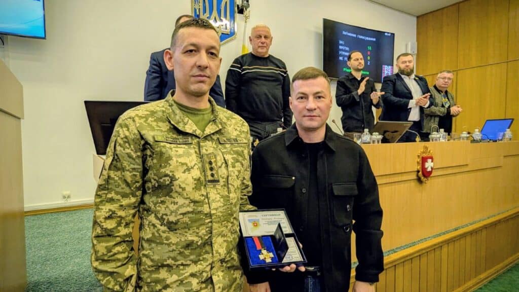 Нагороду присвоїли Тарасу Деркачу, Олександру Тимощуку та Василю Ящуку. На сесію зміг прибути лише Олександр Тимощук – інші військові нині перебувають на фронті. Йому відзнаку вручили одразу.