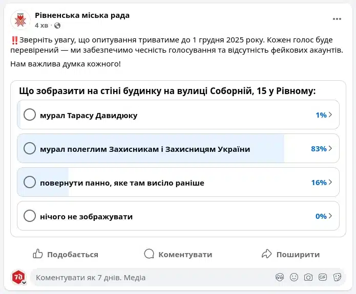 Водночас на сторінці Рівненської міської ради у Facebook запущено ОПИТУВАННЯ серед мешканців, що саме має бути зображено на цій стіні в майбутньому – після офіційного узгодження всіх рішень.
