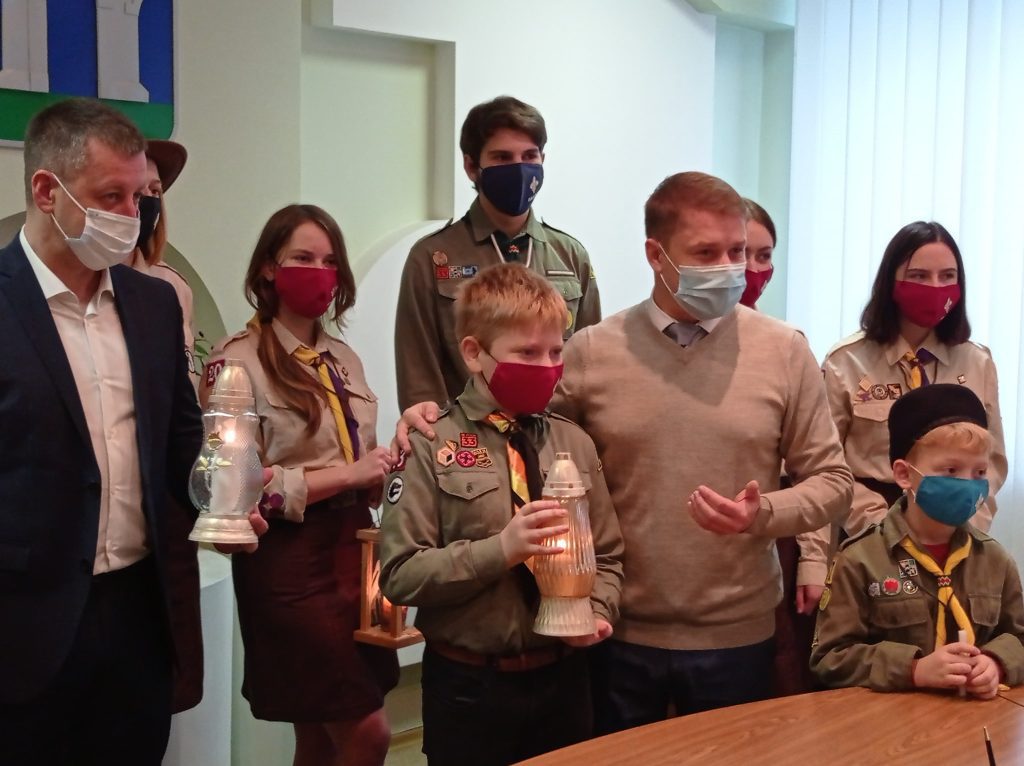 Рівненські пластуни передали Вифлеємський вогонь миру міському голові Олександру Третяку та секретарю Рівнеради Віктору Шакирзяну.