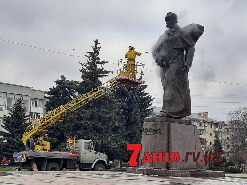Вже не перший рік клінінгова компанія “Добриня Сервіс” очищає від бруду головний пам’ятник обласного центру – монумент Кобзаря на майдані Незалежності. Всі роботи ведуться технікою “Karcher”