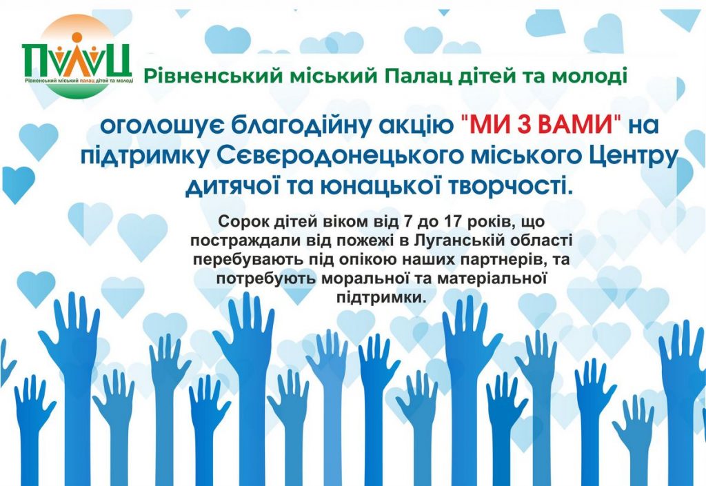 Рівненський міський Палац дітей та молоді оголошує благодійну акцію “Ми з вами” на підтримку Сєвєродонецького міського Центру дитячої та юнацької творчості.