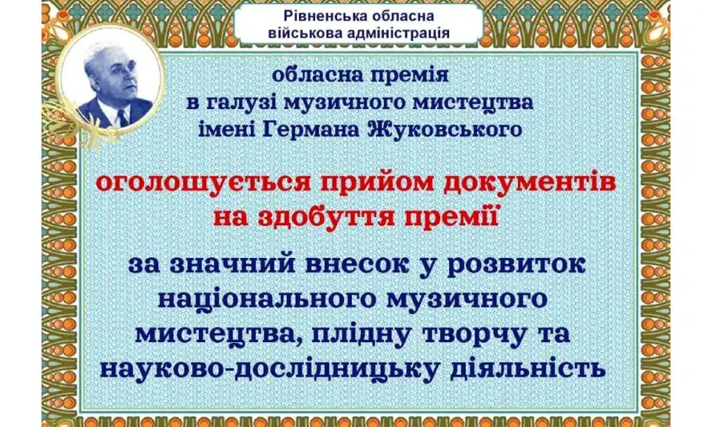 Рівненська обласна державна адміністрація оголосила прийом документів на здобуття у 2025 році обласної премії в галузі музичного мистецтва імені Германа Жуковського.