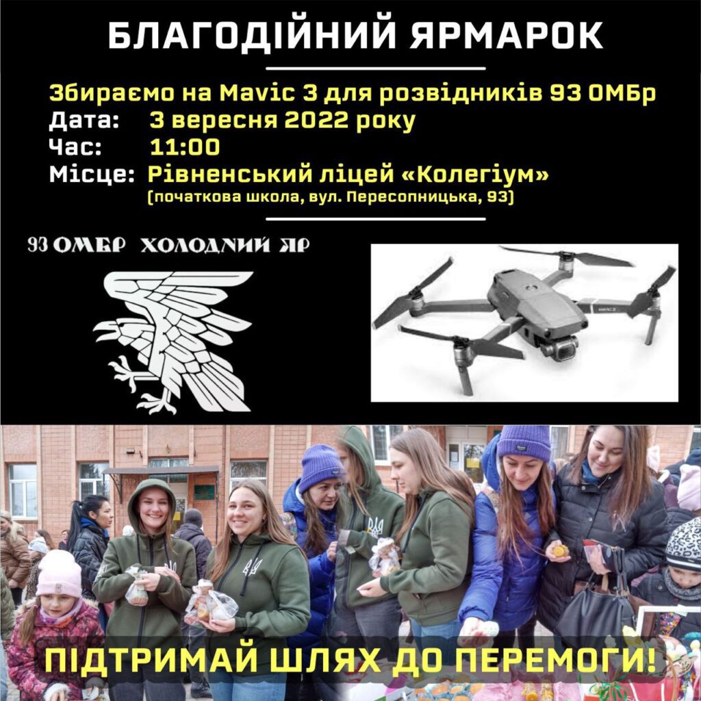 Колегіантська спільнота проводить благодійний ярмарок з метою збору коштів для придбання дрона DJI Mavic 3 для розвідки 93 ОБМр «Холодний Яр». Рівнян запрошують долучитися до доброї справи.
