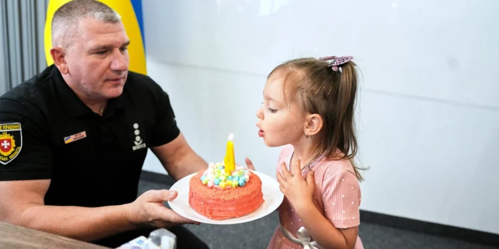 Нині Алінці виповнилось 4 роки, тож татові колеги підготували для неї сюрприз. Спочатку отримала від бійців КОРДу квіти та багато уваги, а потім разом із головним поліцейським області Віктором Шанським задмухала свічку на святковому торті.