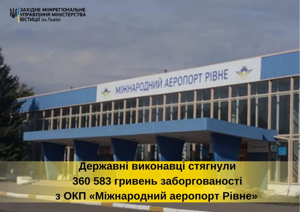 Відділом примусового виконання рішень Управління забезпечення примусового виконання рішень у Рівненській області Західного міжрегіонального управління Міністерства юстиції (м.Львів) в рахунок погашення заборгованості по заробітній платі з арештованих рахунків ОКП «Міжнародний аеропорт «Рівне» стягнуто 360 583 грн по 67 виконавчих провадженнях.