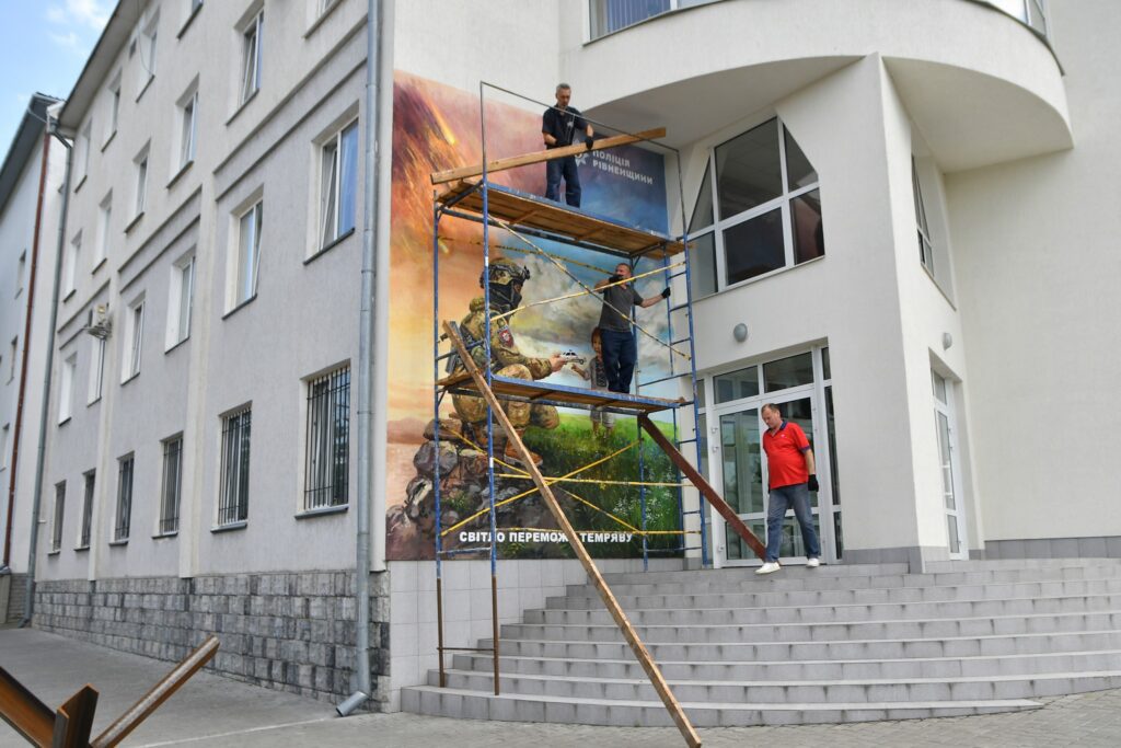 Стінопис з’явився на будівлі Поліції Рівненщини, що знаходиться на вулиці Героїв поліції (донедавна носила назву Олександра Пушкіна). На ньому зображений кордівець, який передає машинку маленькому хлопчику. Це символ захисту найціннішого – наших дітей.