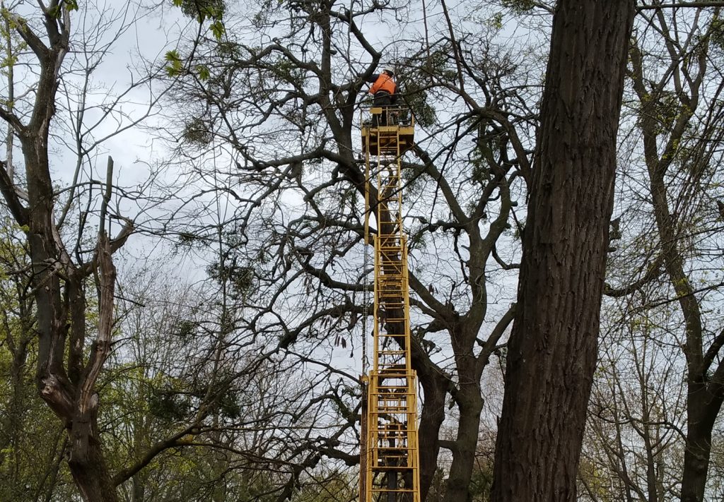 Робітники за допомогою спеціальної безопилки обрізають кущі-паразити з гілок дерев. До самісінької крони дістатися допомагає автовишка. Одразу обрізають і сухі гілки.