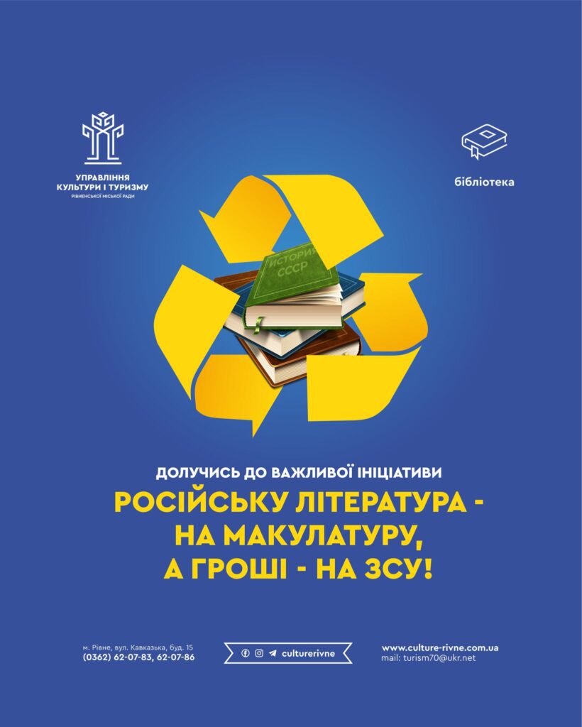 “Централізована бібліотечна система міста Рівного запрошує долучитися до важливої ініціативи. Принесіть російськомовні книжки – допоможіть Збройним Силам України! Книги буде здано на макулатуру, а виручені кошти передано на ЗСУ”, — йдеться у повідомленні.