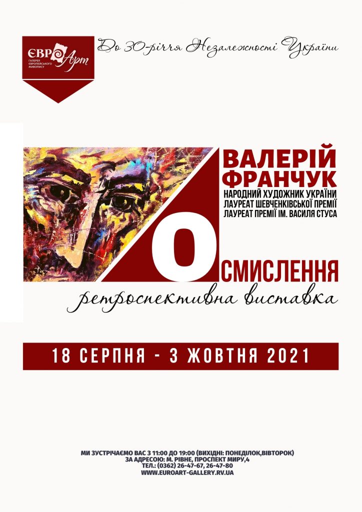 Галерея європейського живопису «Євро-Арт» до 30-річчя Незалежності України презентує ретроспективну виставку (живопис, скульптура) народного художника України, лауреата Шевченківської премії та премії ім. В. Стуса Валерія Франчука – «ОСМИСЛЕННЯ»