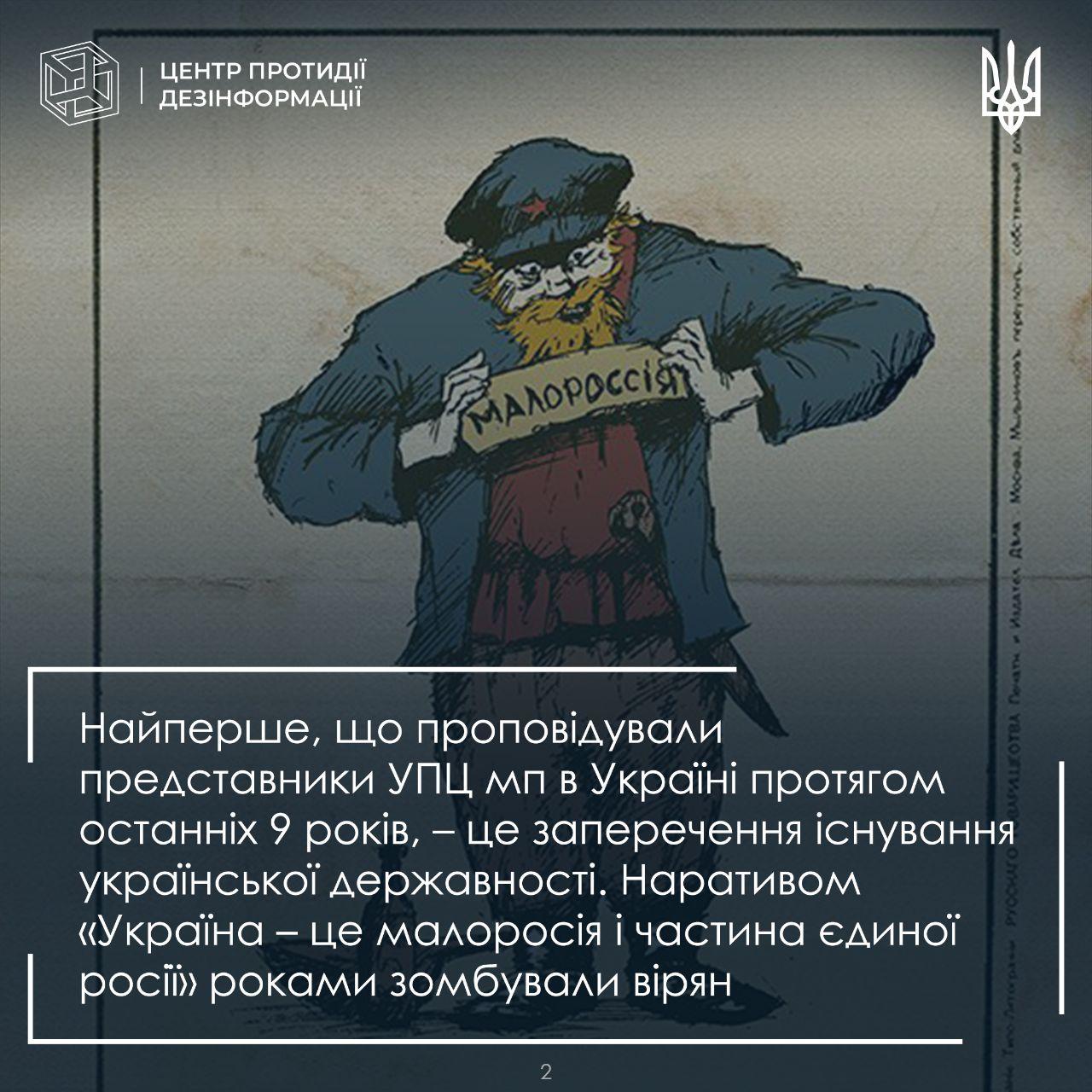 Найперше, що проповідували представники УПЦ мп в Україні протягом останніх 9 років, – це заперечення існування української державності. Наративом «Україна – це малоросія і частина єдиної росії» роками зомбували вірян.