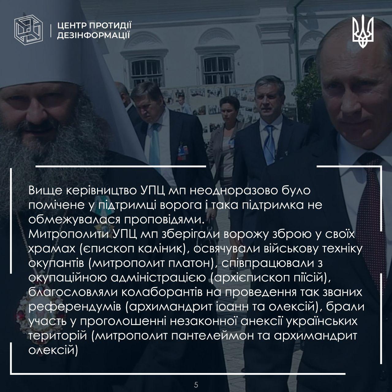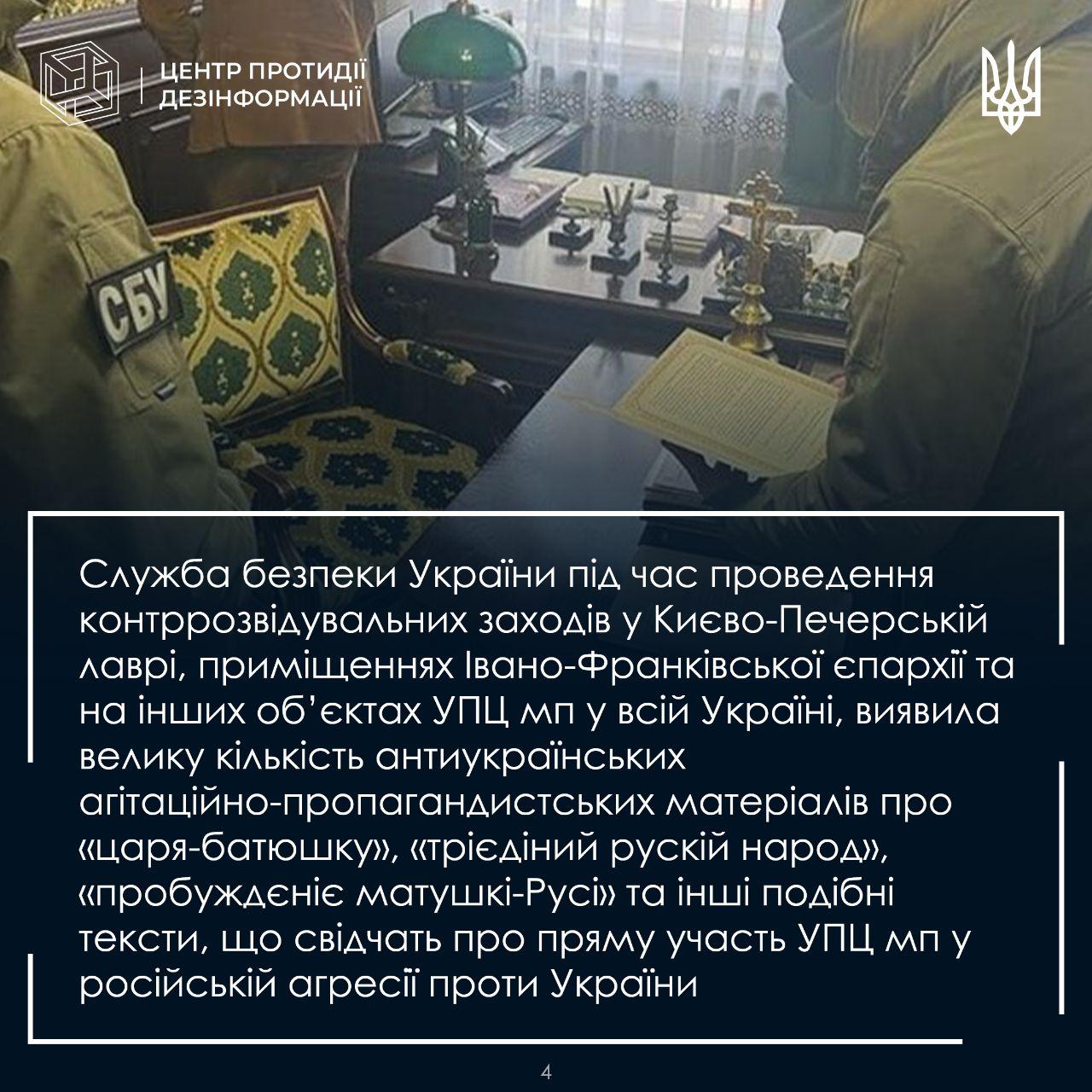 Служба безпеки України під час проведення контррозвідувальних заходів у Києво-Печерській лаврі, приміщеннях Івано-Франківської єпархії та на інших об’єктах УПЦ мп у всій Україні, виявила велику кількість антиукраїнських агітаційно-пропагандистських матеріалів про «царя-батюшку», «трієдіний рускій народ», «пробуждєніє матушкі-Русі» та інші подібні тексти, що свідчать про пряму участь УПЦ мп у російській агресії проти України.