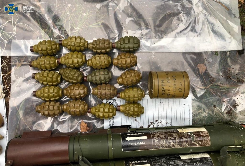 Правоохоронці вилучили зі схрону 4 ручні протитанкові гранати РПГ-22, два кілограми пластиду, 0,5 кг тротилу, саморобний вибуховий пристрій, 12 гранат Ф-1 із запалами, а також майже 1 тисячу набоїв різного калібру.