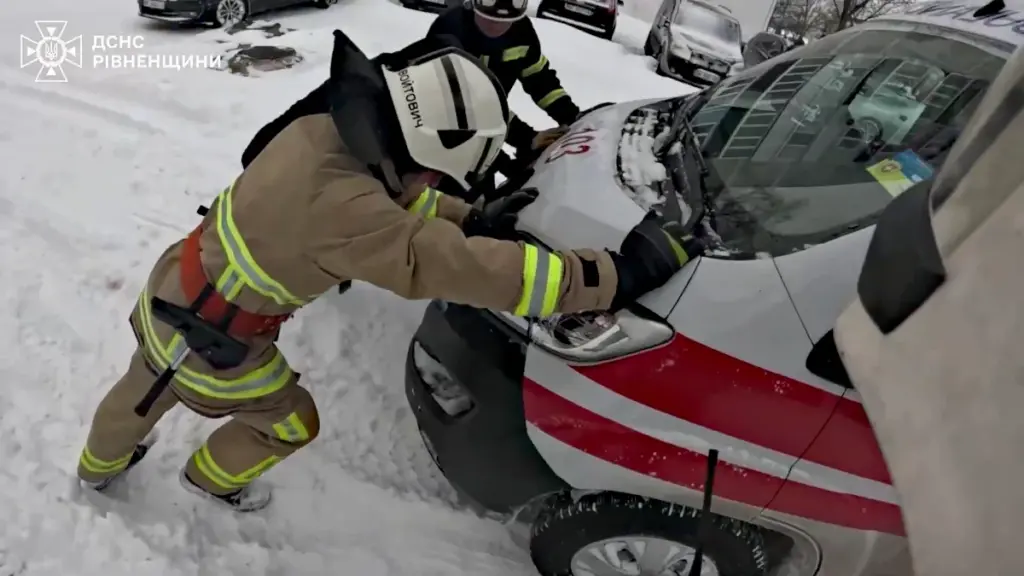 Дорога до лікарні виявилася заблокованою снігом у найкритичніший момент. У Вараші автомобіль екстреної медичної допомоги з пацієнтом усередині не зміг самостійно виїхати із замету. Ситуація вимагала негайних дій – і допомога прийшла з іншої служби.