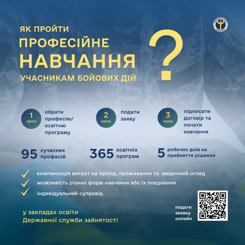 Учасники бойових дій та особи з інвалідністю внаслідок війни за направленнями служби зайнятості можуть безкоштовно пройти навчання у 8 центрах професійно-технічної освіти Державної служби зайнятості за 95 робітничими професіями та 365 освітніми програмами. Термін навчання не перевищуватиме 6 місяців.