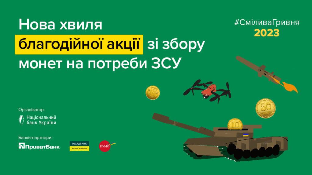 Національний банк України ініціював початок нової хвилі благодійної акції “Смілива гривня”, яка завершиться 30 листопада 2023 року. По всій Україні триває збір монет номіналами 10, 50 копійок та 1, 2, 5 і 10 гривень. Сума зібраних коштів буде перерахована на потреби Збройних Сил України.