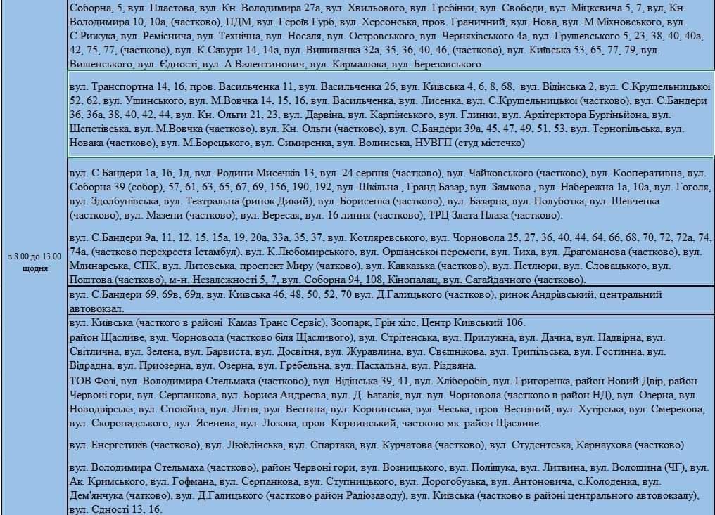вул. Вишиванка 32а, 35, 36, 40, 46, (частково), вул. Київська 53, 65, 77, 79, вул. Вишенського, вул. Єдності, вул. А.Валентинович, вул. Кармалюка, вул. Березовського, вул. Транспортна 14, 16, пров. Васильченка 11, вул. Васильченка 26, вул. Київська 4, 6, 8, 68, вул. Відінська 2, вул. С.Крушельницької 52, 62, вул. Ушинського, вул. М.Вовчка 14, 15, 16, вул. Васильченка, вул. Лисенка, вул. С.Крушельницької (частково), вул. С.Бандери 36, 36а, 38, 40, 42, 44, вул. Кн. Ольги 21, 23, вул. Дарвіна, вул. Карпінського, вул. Глинки, вул. Архітерктора Бургіньйона, вул. Шепетівська вул. М.Вовчка (частково), вул. Кн. Ольги (частково), вул. С.Бандери 39а, 45, 47, 49, 51, 53, вул. Тернопільська, вул. Новака (частково), вул. М.Борецького, вул. Симиренка, вул. Волинська, НУВГП (студ містечко)