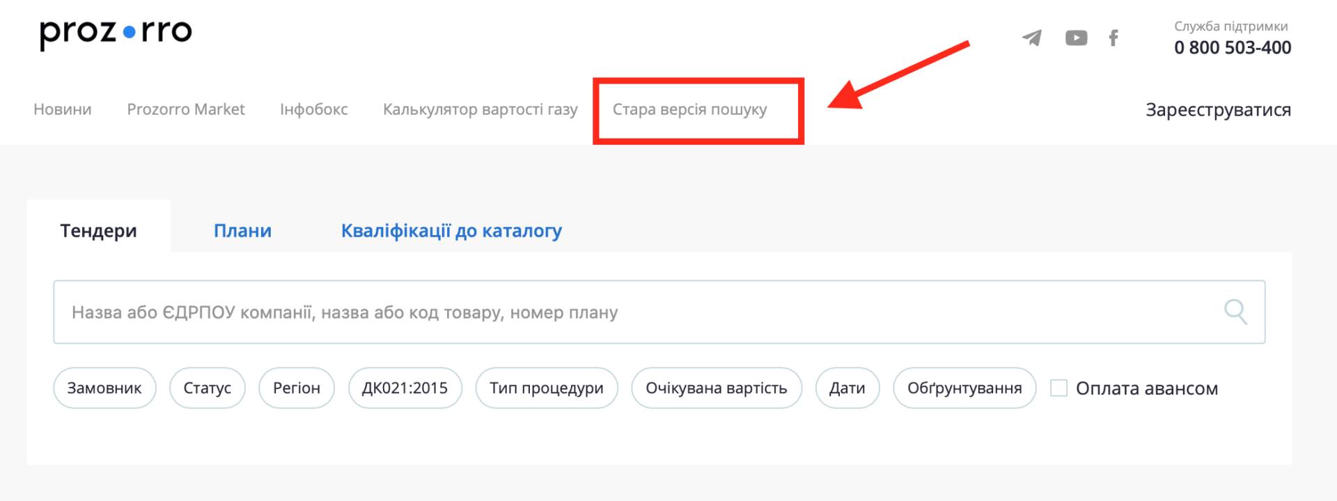 Тож якщо вам бракує певних функцій у пошуку на новому порталі, ви можете скористатись старим. Перейти на нього ви зможете у шапці порталу prozorro.gov.ua