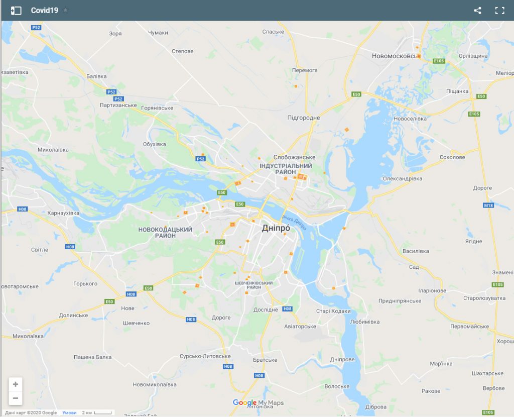 В Дніпрі також також створена інтерактивна карта, на якій зазначено райони, де зафіксовані випадки зараження Covid-19.