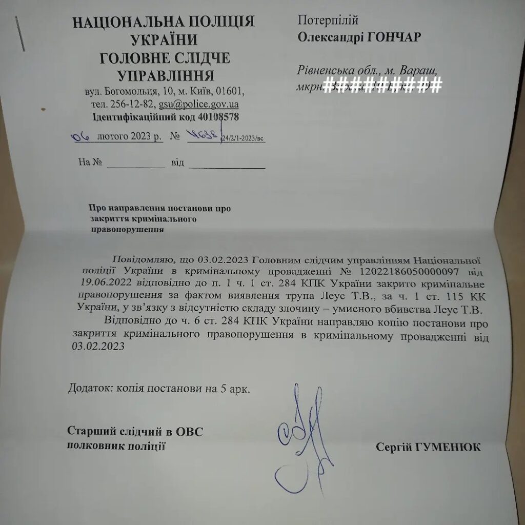 І от наприкінці лютого донька загиблої отримала листа від офіційних органів в якому вказано, що через відсутність складу злочину кримінальне правопорушення закрите. Нижче наводимо оригінал допису доньки у мережі Фейсбук.