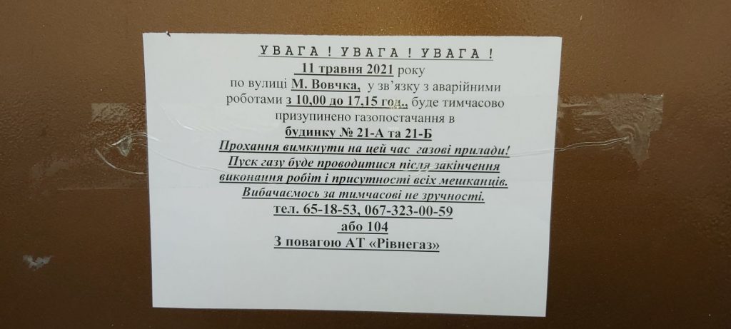 На дошках оголошень деяких будинків Рівного 11 травня з’явилася об’ява про те, що працівники Рівнегазу ліквідовують аварійну ситуацію. Відтак, у трьох багатоповерхівках по вулиці Марка Вовчка буде відключено газопостачання до 17.15.