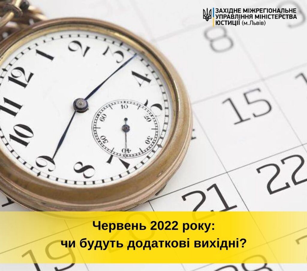 Відповідно до статті 73 Кодексу законів про працю цього року на червень припадає два святкові дні: Трійця і День Конституції. Як зазначено у статті 67, якщо святковий або неробочий день, визначений статтею 73 КЗпП, збігається з вихідним, то вихідний день переноситься на наступний після святкового або неробочого. Так мало б статися з 13 червня (перенесення вихідного з 12.06, коли святкують Трійцю). Крім того, 28 червня (вівторок) – це святковий день, відзначається День Конституції України. У мирний час це був би вихідний день.