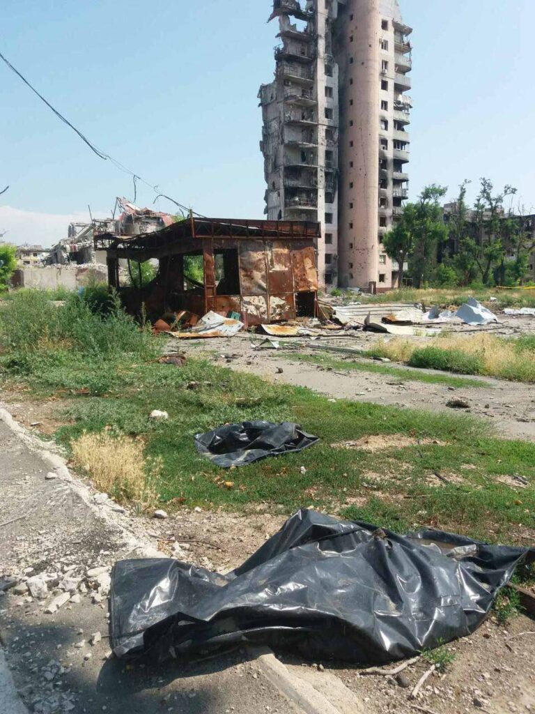 На фото видно тіло чоловіка в мішку на перехресті вулиць Ломізова та Азовстальської. Такі випадки непоодинокі. У місті повна антисанітарія і відсутнє належне медичне обслуговування.