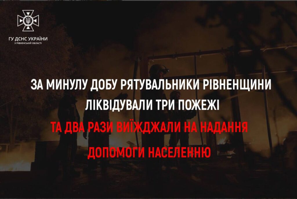 Три пожежі за минулу добу ліквідували рятувальники Рівненщини. Крім того, два рази вони виїжджали на надання допомоги населенню.