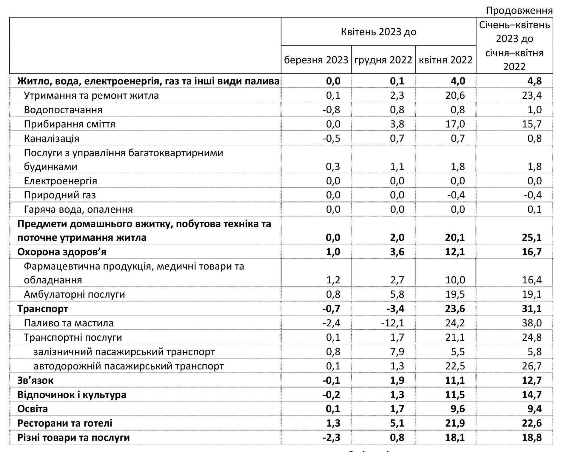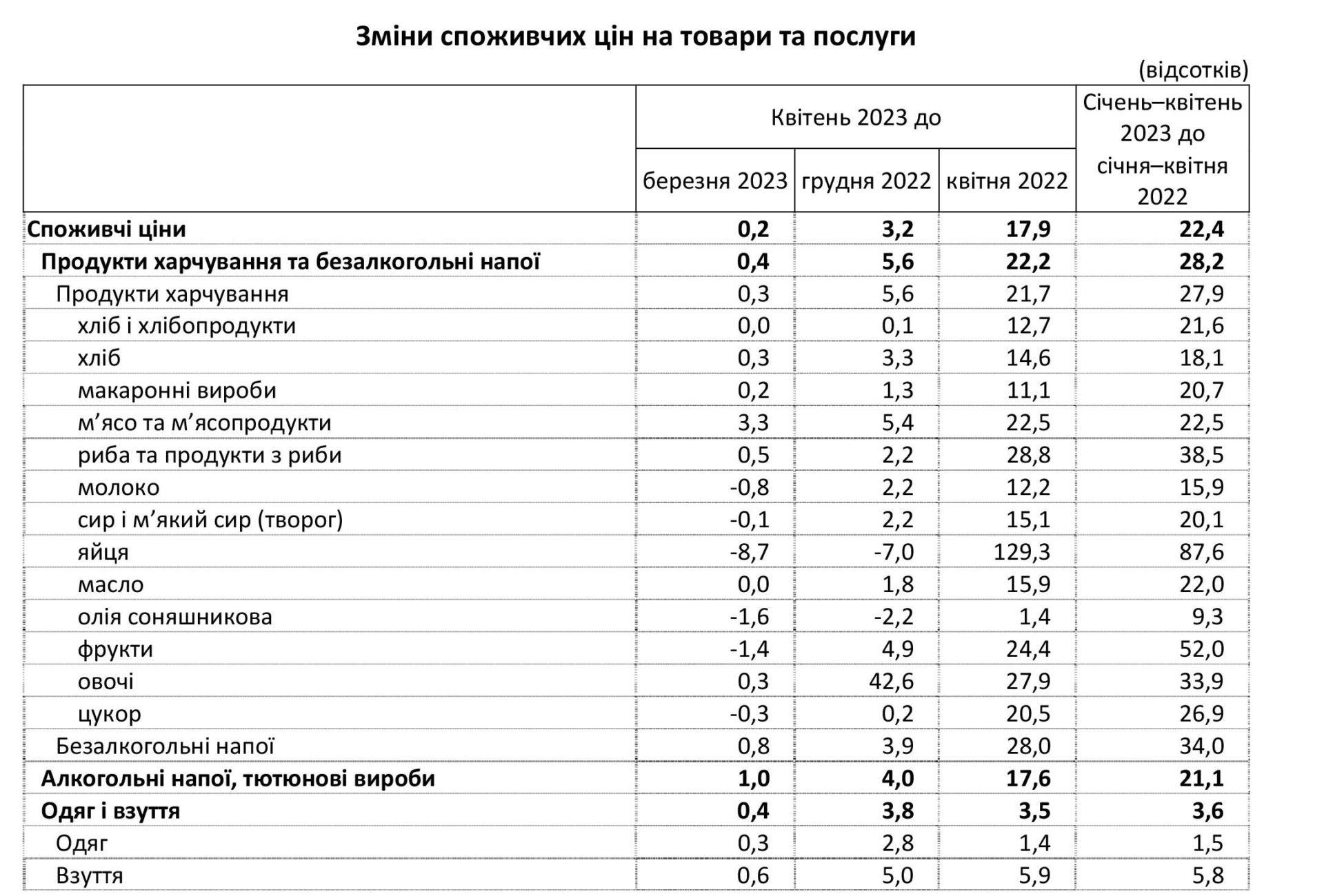 У квітні ціни на продукти харчування та безалкогольні напої зросли на 0,4%. Найбільше (на 7,4%) подорожчала свинина. На 1,8–0,3% зросли ціни на яловичину, м’ясо птиці, кисломолочну продукцію, безалкогольні напої, рибу та продукти з риби, хліб, овочі.