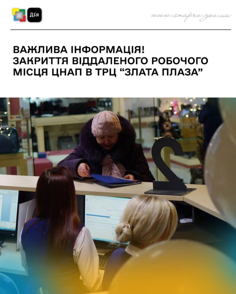 З 28 лютого 2025 року віддалене робоче місце ЦНАП у ТРЦ «Злата Плаза» припинить свою роботу. Про відкриття нових робочих місць повідомимо згодом.