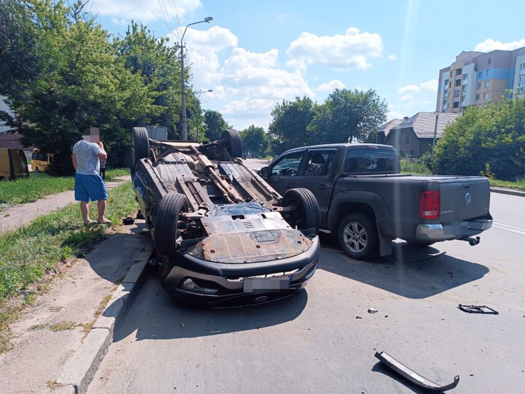 Поліція виявила, що 30-річна жителька обласного центру, яка керувала автомобілем «Kia Sportage», коли виїжджала з прилеглої території, не надала переваги пікапу «Volkswagen Amarok». Зіткнення призвело до перекидання кросовера.