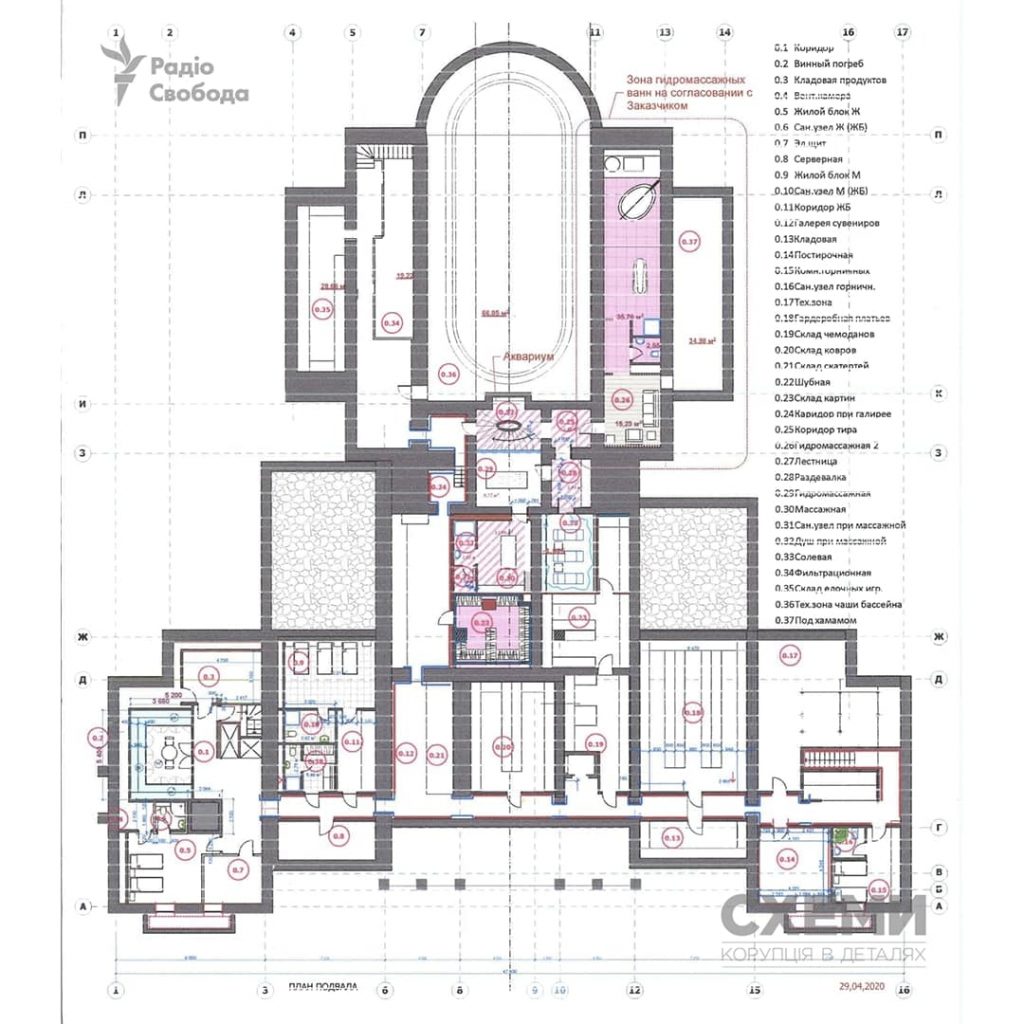 Цокольний поверх облаштований пральною, кімнатою для покоївок, окремим величезним гардеробом для суконь дружини політика Оксани Марченко, приміщенням для зберігання картин (їх у подружжя 530, без урахування 227 ікон), складом для килимів і шубосховищем — окремим приміщенням для зберігання шуб. Також на цокольному поверсі є житлові блоки, які, можливо, обладнані як бункери, масажна, сольова кімната, зона гідромасажних ванн, технічна зона й окрема кімната, підписана як склад ялинкових іграшок.
