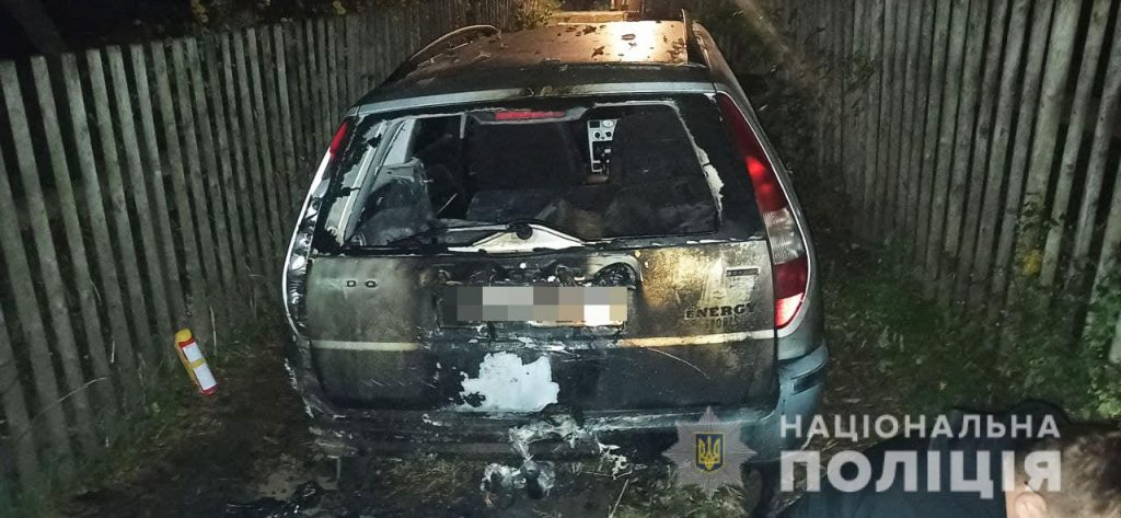 Вогонь повністю знищив задню частину авто. З місця події поліцейські вилучили пожежне сміття, пластикову пляшку та змиви паливно-мастильних матеріалів.