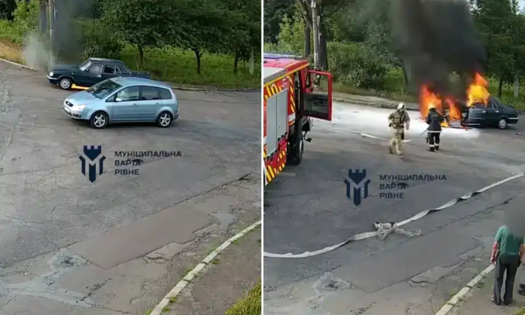 Момент загоряння автомобіля у Рівному на перехресті вулиць Гашека та Тиннівська зафіксували камери спостереження.