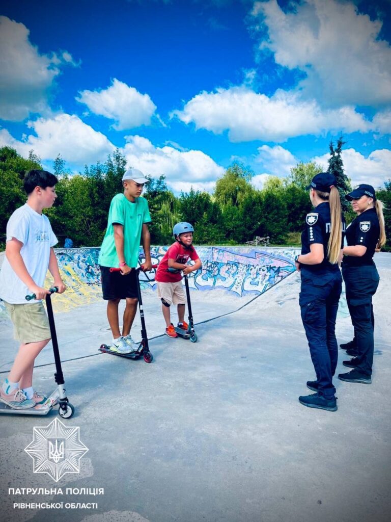 Інспектори відділу зв’язків з громадськістю обговорили з дітьми правила безпеки під час катання на велосипедах, самокатах та скейтбордах.