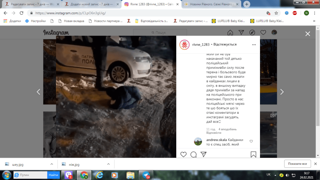 На відео видно двох поліцейських та жінку з кайданками на руках, яка лежить на снігу. Моменту затримання і чому жінка опинилася на снігу на відео не зафіксовано. А ось коментатори один поперед одного почали засуджувати дії поліцейських.