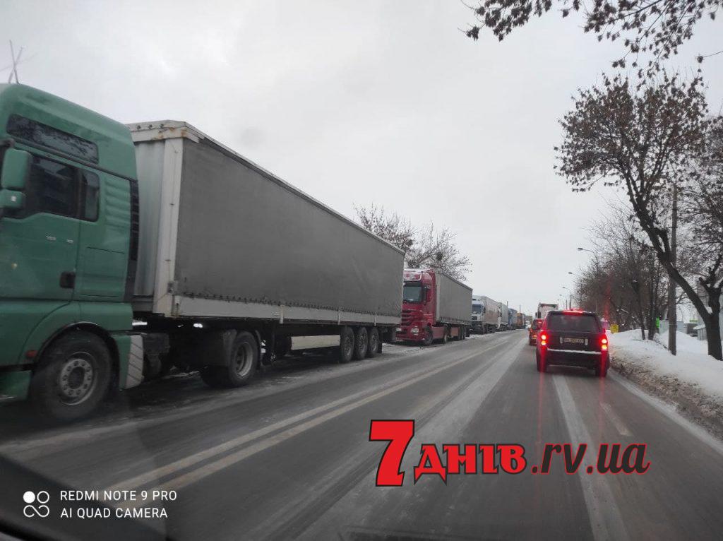 Довжелезний корок утворився на вулиці Млинівській у Рівному. Транспортний колапс біля митниці: фури стоять аж до луцького кільця.