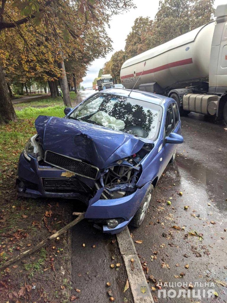 На місці події поліцейські встановили, що водій вантажівки «Volvo» із автоцистерною, 47-річний житель Полтавської області, під час перестроювання із правої смуги в ліву не врахував дорожню обстановку та допустив зіткнення із автомобілем «Chevrolet Aveo» під керуванням 49-річної рівнянки. Від удару легковик відкинуло на узбіччя, де він врізався у дерево.