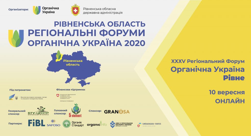 10 вересня 2020 року в місті Рівне відбудеться XXХV регіональний форум “Органічна Україна”. Захід проходитиме на платформі Zoom за сприяння Громадської спілки органічних сертифікованих продуктів «Органічна Україна» під патронатом Міністерства розвитку економіки, торгівлі та сільського господарства України та Рівненської ОДА.