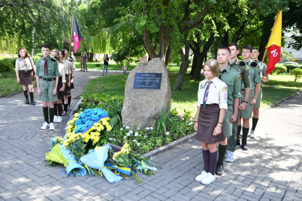 Разом містяни проспівали гімн та хвилиною мовчання вшанували усіх українців, які загинули боронячи незалежність нашої держави. Також поклали квіти до каменю, на місці якого планують встановити пам’ятник Героям Небесної Сотні та загиблим в зоні АТО.