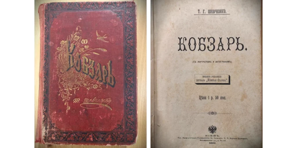 На фото – “Кобзарь” Тараса Шевченка, виданий у 1899 році в редакції журналу “Кіевская Старина”. У той час наша держава перебувала у складі російської імперії, тому назва зросійщена.