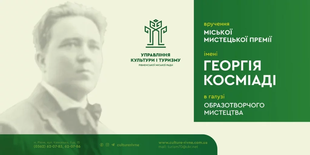 Вручення премії за досягнення у галузі образотворчого мистецтва відбудеться у понеділок, 25 березня 2024 року о 12:00 годині, у приміщенні Арт-ательє “Георгій Косміаді” за адресою вул. Драгоманова, 32.