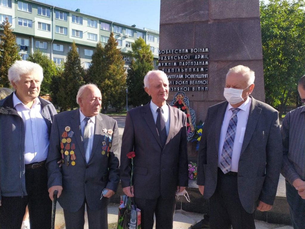 На фото: ветерани Синяк і Сацюк разом із міським головою біля Рівненського меморіалу Визволителям.