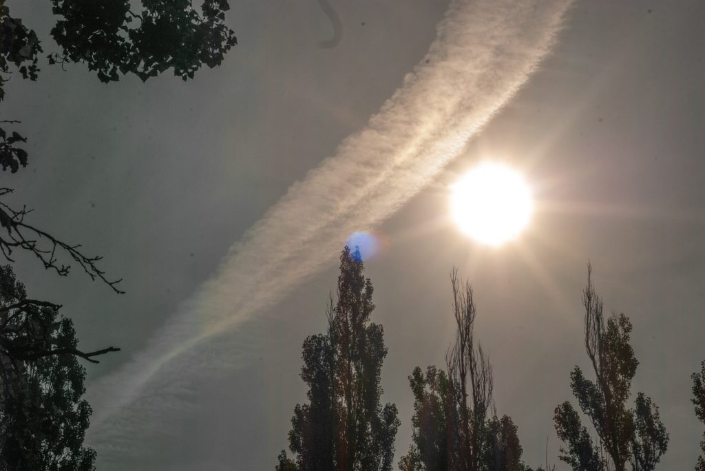 Що це за літаки літають вже котрий день над Рівним і залишають ось це? Тільки не кажіть про звичайні пасажирські літаки, бо бачила і їх, вони значно вище, так криво не літають і таких слідів не лишають. Від цих штук в небі на невеликій висоті стоїть пелена, і в повітрі сьогодні легкий “туман”. Фото зроблено сьогодні о 10 ранку по вул. Шухевича.