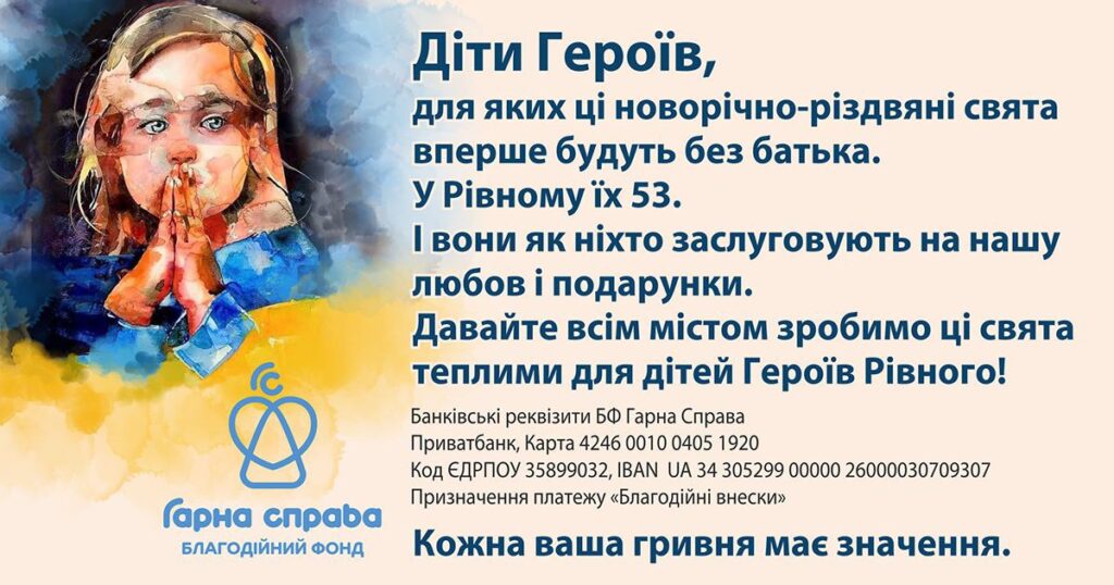 Підтримати дітей Героїв Рівного, для яких прийдешні новорічно-різдвяні свята вперше будуть без батька, взявся Благодійний фонд «Гарна Справа».