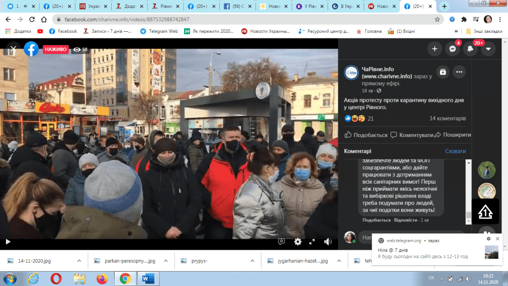 На майдані зібралося кілька десятків людей, є представники поліції. Люди обурені, що змушені зачинити свої крамниці у суботу та неділю через так званий карнтин вихідного дня. Кажуть, у ці дні отримують 60% свого прибутку. Прийшли й торговці з ринків, де нині не працюють ті ряди, де продають непродовольчі товари. Особливо незадоволені тим, що нині продовжують працювати великі ТЦ, де продають промислові товари, зокрема, Епіцентр.