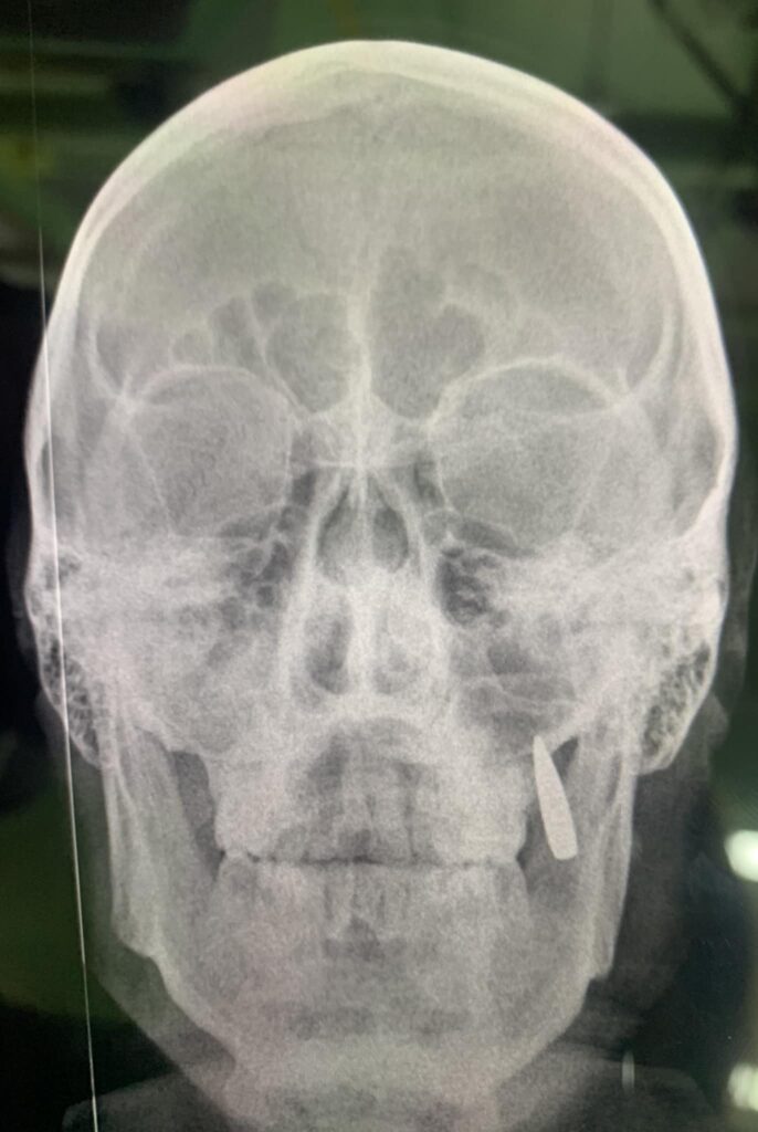 Про “імплант” з ворожої кулі, який отримав український боєць розповіла громадській діяч Оксана Корчинська. Під час огляду поранених один з бійців просив його швидше відпустити, бо почував себе добре . Турбував тільки невеликий поріз на щоці та відсутність курева. Після ретельного огляду медиками та рентгену виявилось, що замість двох зубів , в щелепі застрягла куля.