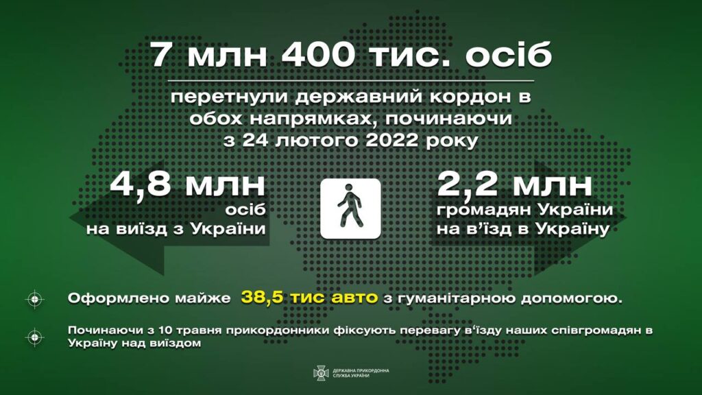 Усього з 24 лютого по 24 травня як на в‘їзд, так і на виїзд з України, співробітники Держприкордонслужби оформили понад 7,4 млн осіб. З них на виїзд з країни прослідували більш як 4,8 млн осіб, переважна більшість з яких – громадяни України.