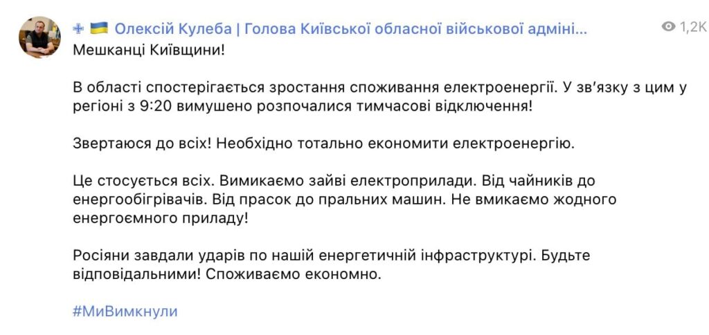 З 9:20 на Київщині розпочалися тимчасові відключення через зростання споживання електроенергії, — голова Київської ОВА Кулеба.