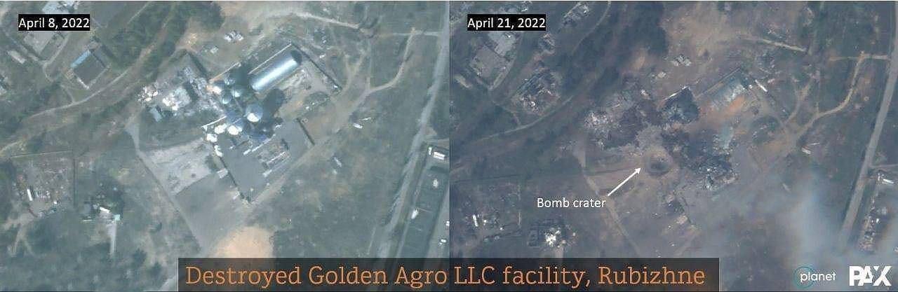 Супутникові знімки від компанії «Planet Lab» свідчать про те, що на територію ТоВ «Голден АГРо» у Рубіжному були скинуті потужні російські бомби. Відкритий 2020 року елеваторний комплекс повністю знищено.