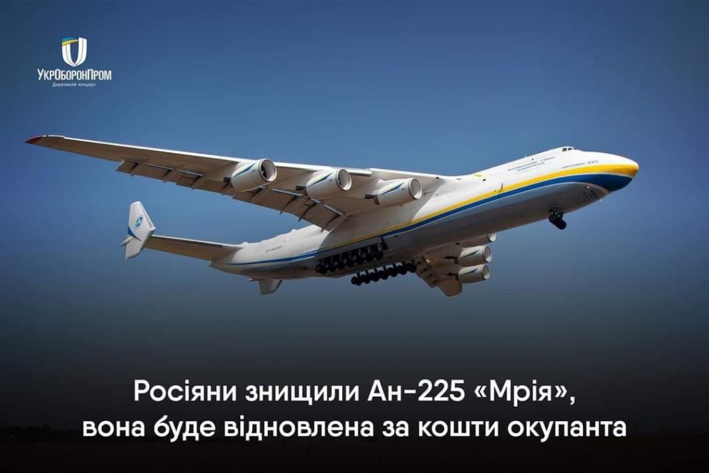 Флагман української авіації Мрія буде відновлено за кошти окупанта повідомляє Укроборонпром.